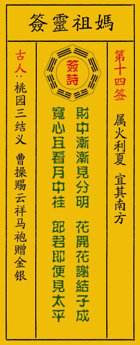 【台湾北海观音明善堂】即将来临的财运或好运已渐渐明显,正像那花开花谢后,结满了果实一样。无须焦急不安,且宽心等待中秋节的到来,你所企盼的愿望将会圆满达成。求得此签暗示目前福报尚平平,问事求谋,宜求神明祈福可得圆满。如问事业,表示已有转机,财运也将慢慢到来即使目前财利不显,但只要耕耘,必有收获。只怕不肯用心努力,随世浮沉,就像那花开花谢,月亮盈亏,得失相伴。问功名,也是一样,如果不去充实自己,只想碰运气,是难得有成就的。问婚姻,有情人终成眷属,婚姻可成。问诉讼,只要出于至诚,必能平安无事,能破财消灾。问疾病,危险有阴邪元辰暗淡,宜消灾。 【台湾育德妈祖同修会】财运来临渐渐显明,正像那花开花谢后,结成满树的果实。不必焦急,且宽心等待中秋节到来,你所等待的郎君将与你共渡那太平惬意的日子了!至友李君出国久无音讯,其夫人至妈祖庙抽得此签,不久,在中秋前夕,李君自国外归来,正应了第三、四句,传为奇谈。抽到此签,如问事业,表示你的事业已有转机,你的财运也将慢慢到来,即使目前财利不显,但只要耕耘,必有收获。只怕不可用心,随世浮沉,就像那花开花谢,月亮盈亏,得失相半。问功名,也是一样,如果不去充实自己,只想碰运气,是难得成就的。问婚姻,有情人终成眷属之兆,婚谈可成。问诉讼,只要出以至诚,必能平安无事,能破财消灾,是为上策,意气之争,得不偿失。 |